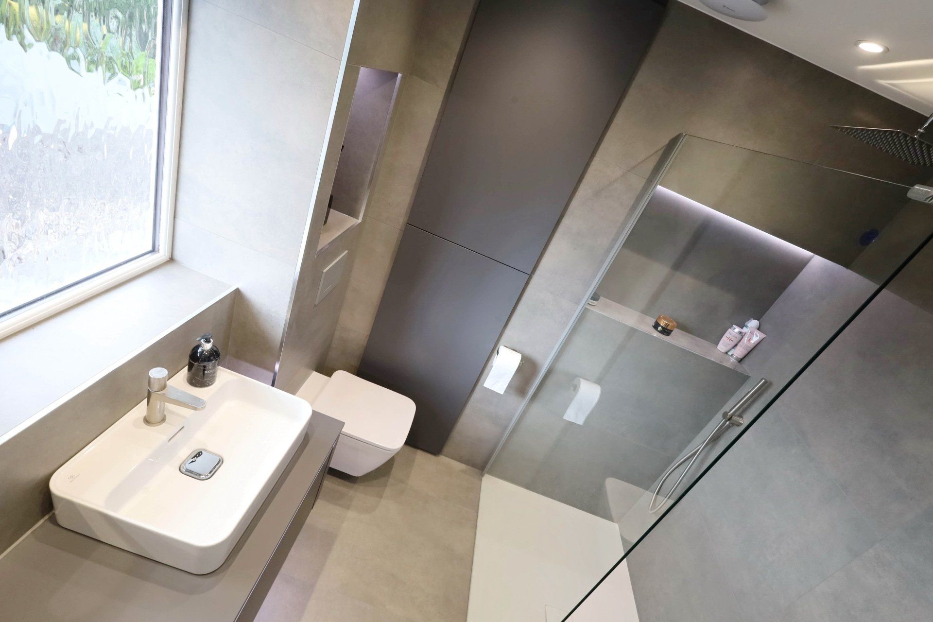 RAK products were used throughout, a unique feature being the large shower with a flush shower tray, creating a seamless look. The niche in the shower complimented the smooth lines throughout the bathroom, giving a stylish space for shampoo bottles and more to be displayed in the shower for ease and convenience. We also added a decorative niche above the toilet.