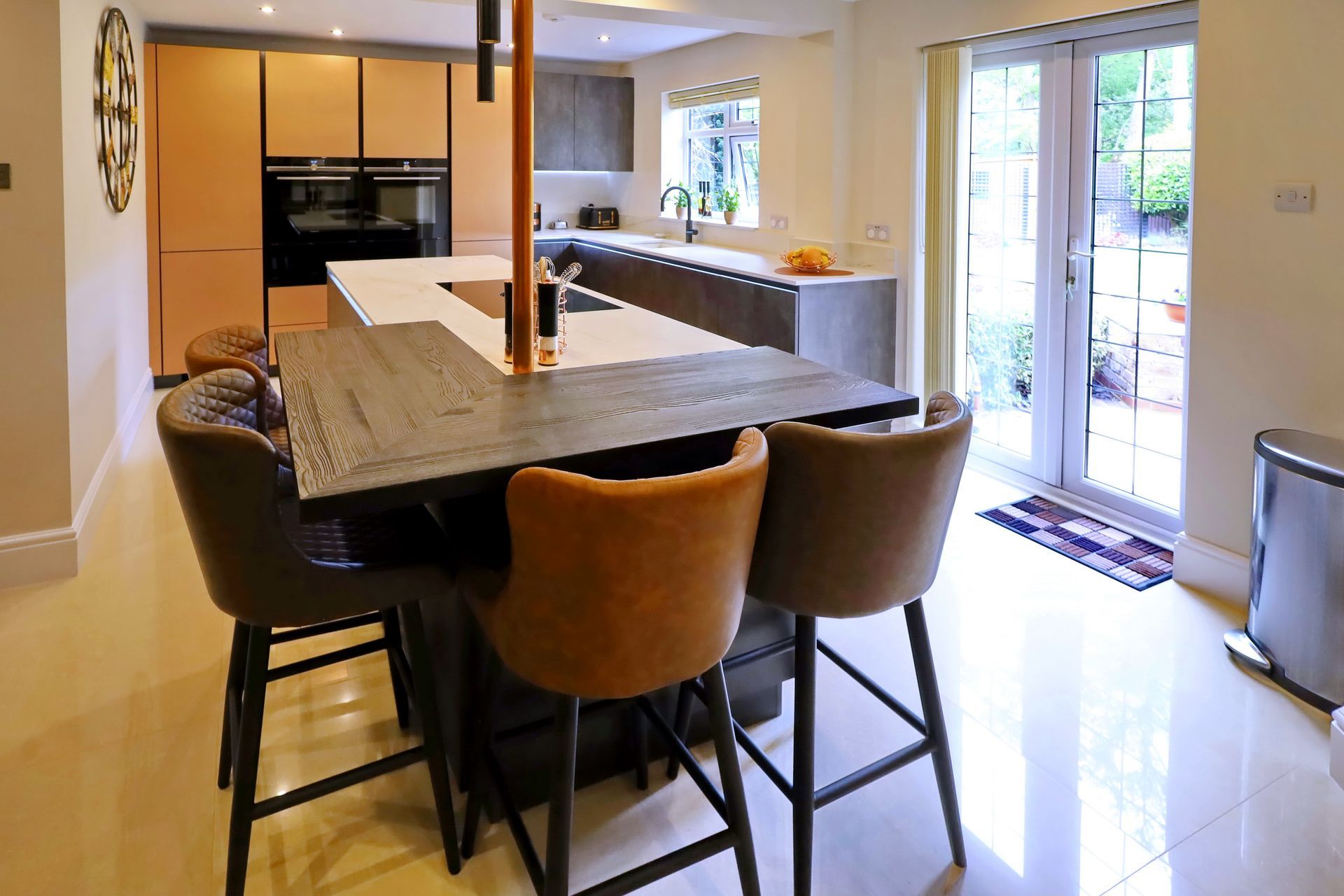 We faced a unique challenge due to the existing underfloor heating system. Modifying the floor structure was not an option. Nevertheless, the Bruces expressed their desire for an island with a hob, which required a power supply. To overcome this obstacle, we installed a copper pipe that elegantly went down from the ceiling, seamlessly delivering the required power while in theme with the kitchen's overall design. This approach allowed us to meet the Bruces needs without compromising on functionality or aesthetics.