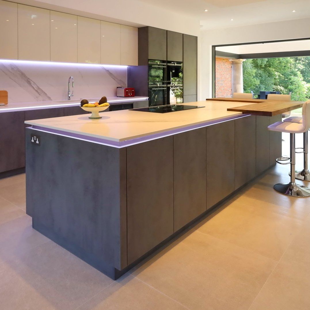 SPEKVA Antique Oak breakfast bar with a seating area was included in the island, adding an element of comfort and warmth. This perfectly compliments the two-tone Concrete Dark and
