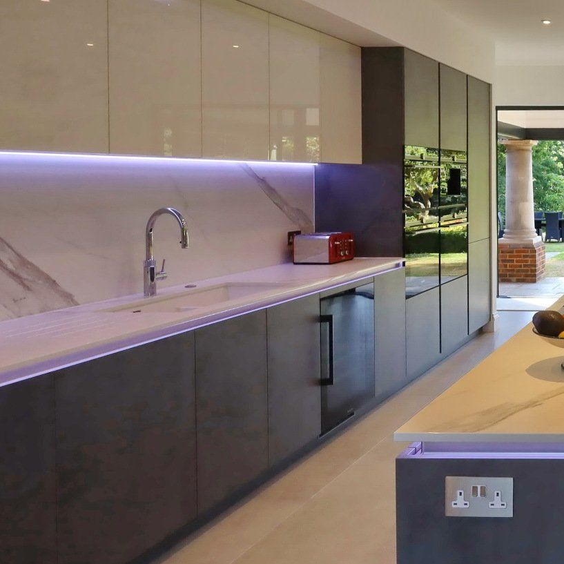 This was all made better through the unique lighting of the room: the couple chose warm white spotlights to softly illuminate the space from above whilst hidden cold-white LEDs run beneath the worktops and white gloss wall units. These work together to create a bright and inviting atmosphere.