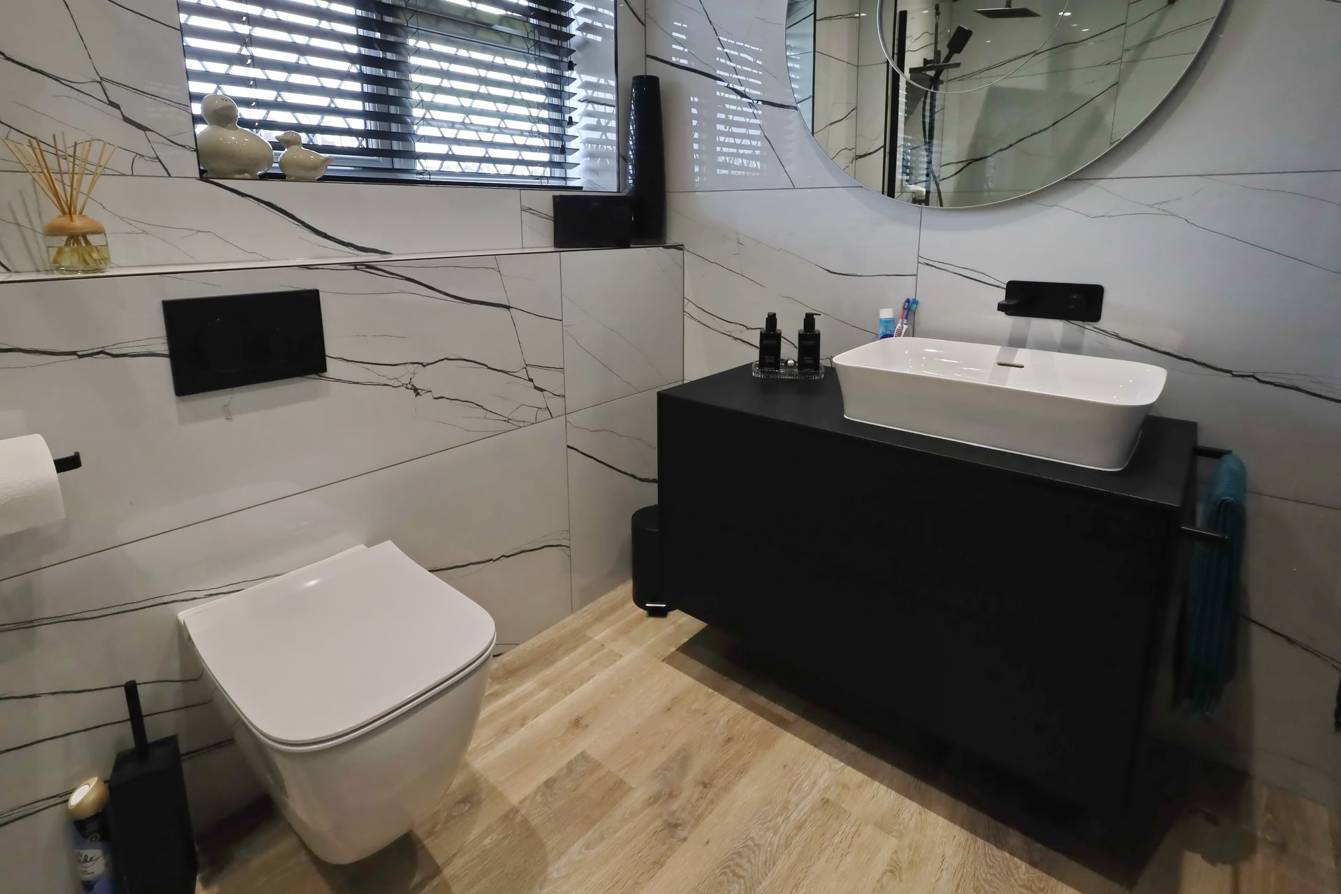The customer had in mind a contemporary style bathroom, but didn’t yet have an exact vision; that’s where we came in. After a visit to our Wokingham showroom, they were inspired by one of our bathroom displays and unique tile samples: a large white marble tile with a deep black lane.