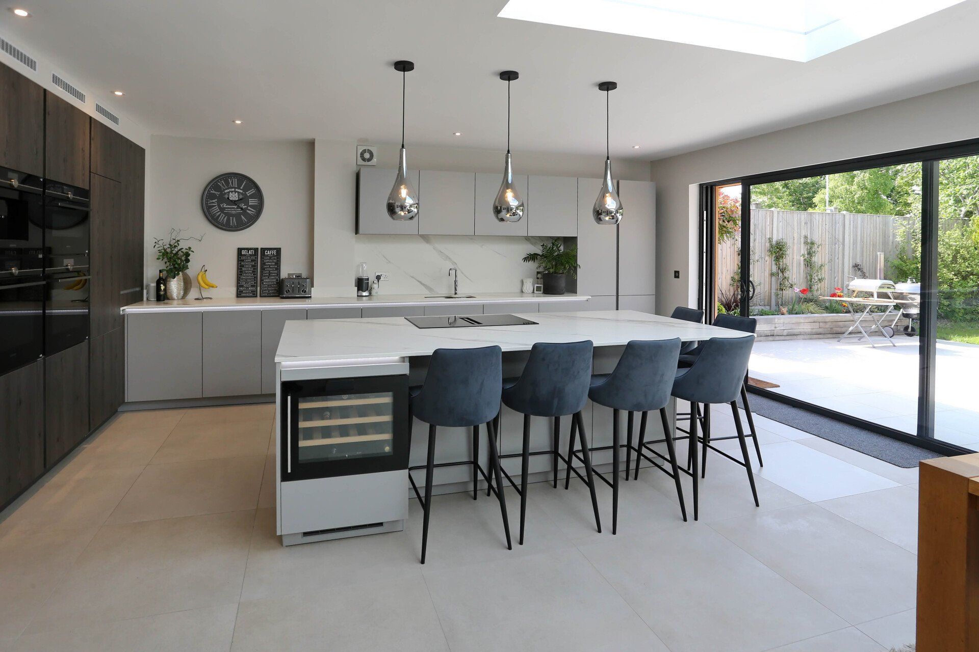 contemporary, open plan kitchen for their extension that would be timeless and suitable for the whole family. It was important that this kitchen would be a place for socialising for the whole family, as well as having lots of storage space.