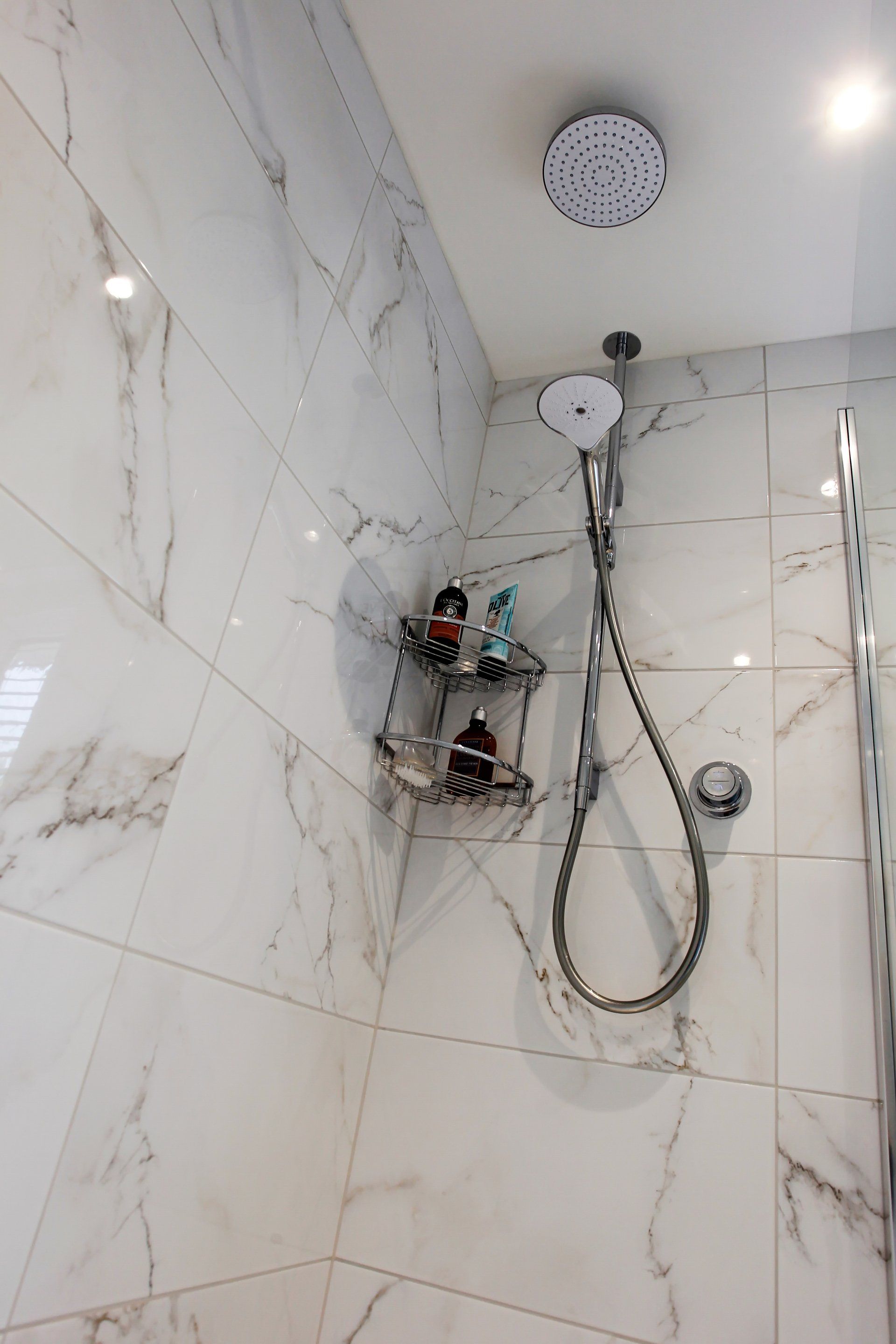 The client was keen to create a marbled look that would create a sense of grandeur, thus we suggested our large format 120x60cm matt calacatta marble effect porcelain tile. With a cool white base colour and the addition of a charcoal vein, this tile is truly striking. This project challenged previous conventions of a marble design with a complimentary wooden floor to harmonise the colour scheme with warmer tones. The end result of this project boasts an exquisite spa-inspired look that provides a timeless and practical bathroom for our clients to enjoy for years to come.